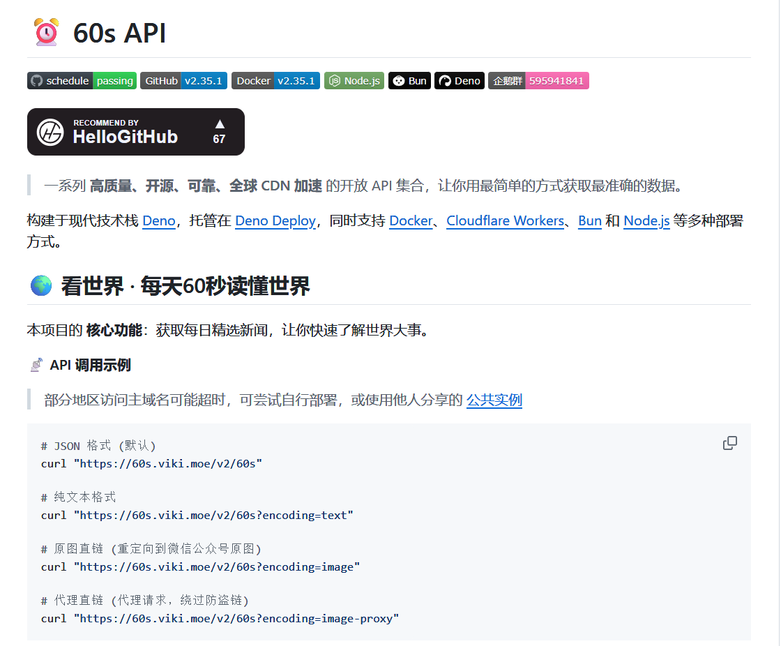 基于@vikiboss 大佬的60s项目 搭建了一个热榜api 具体使用方法可以参考官方的使用文档,这里不赘述了。 可以应用于自己的网站,也可以制作独立网页应用...